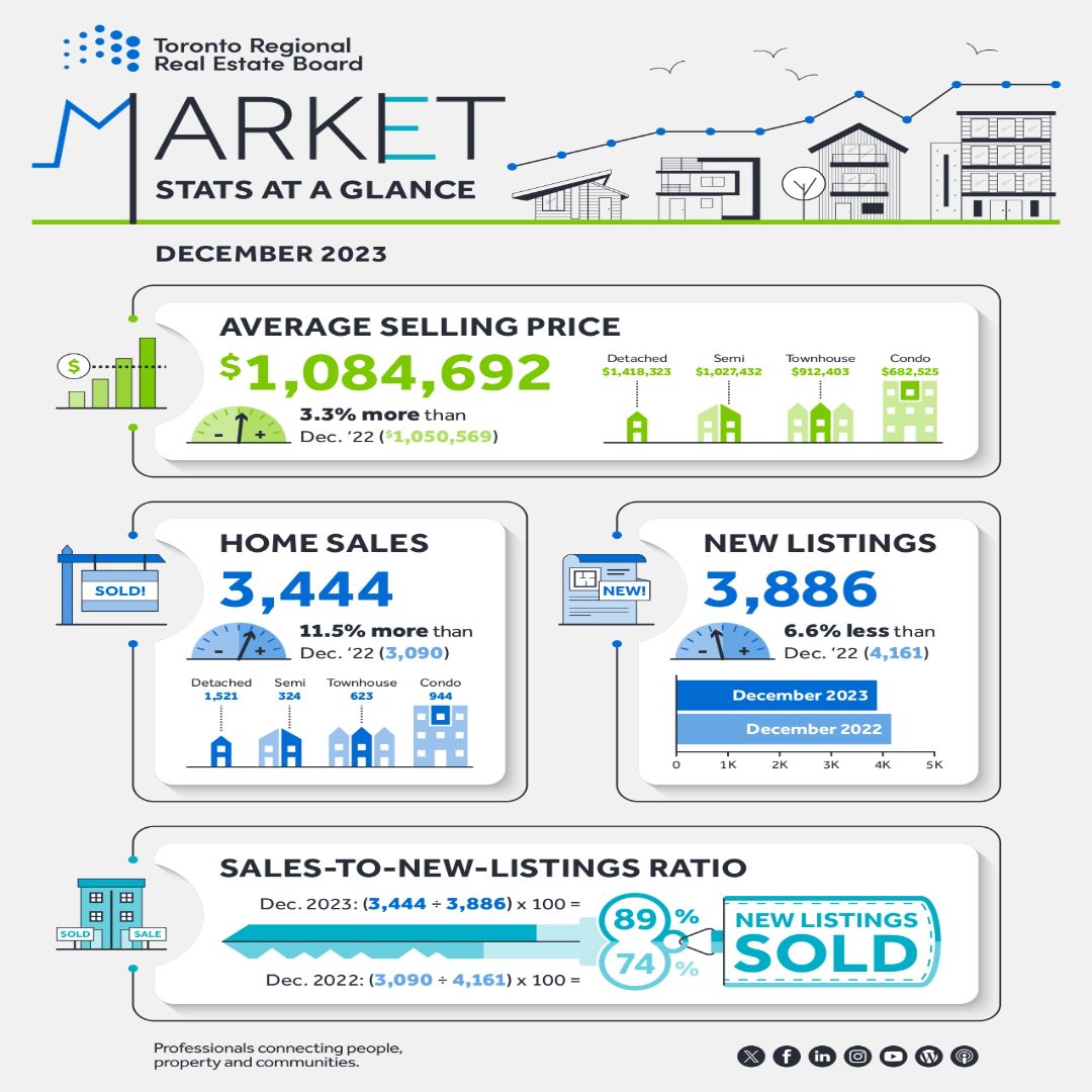 In December, there were 3444 sales for the month, up 11.5% year-over-year. The average sales price was $1,084,692, up 3.2%. New listings were down 6.6%, and with active listings now at 10,370, there is currently a 3.01-month supply within the TRREB region.