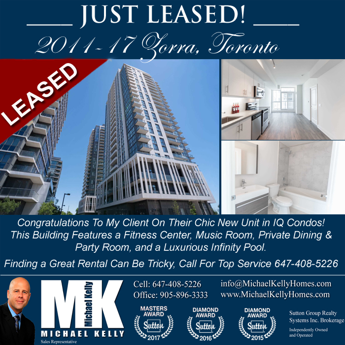 Leased! 2011-17 Zorra St, TorontoCongratulations to my client on his chic new unit in the Park Towers Condos by Remington. This condo features state of the art amenities that includes a gym, sauna, Concierge, party room, games room and so much more! If you're looking to lease, invest or sell in the Etobicoke area, then call Michael Kelly today! |